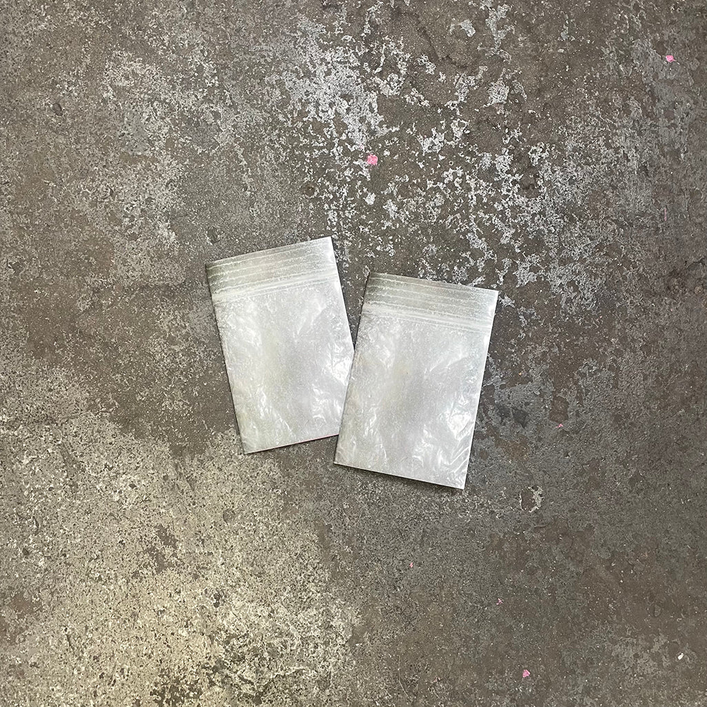 It arrives packaged like a seized party bag, turning the zine into a sculptural object.